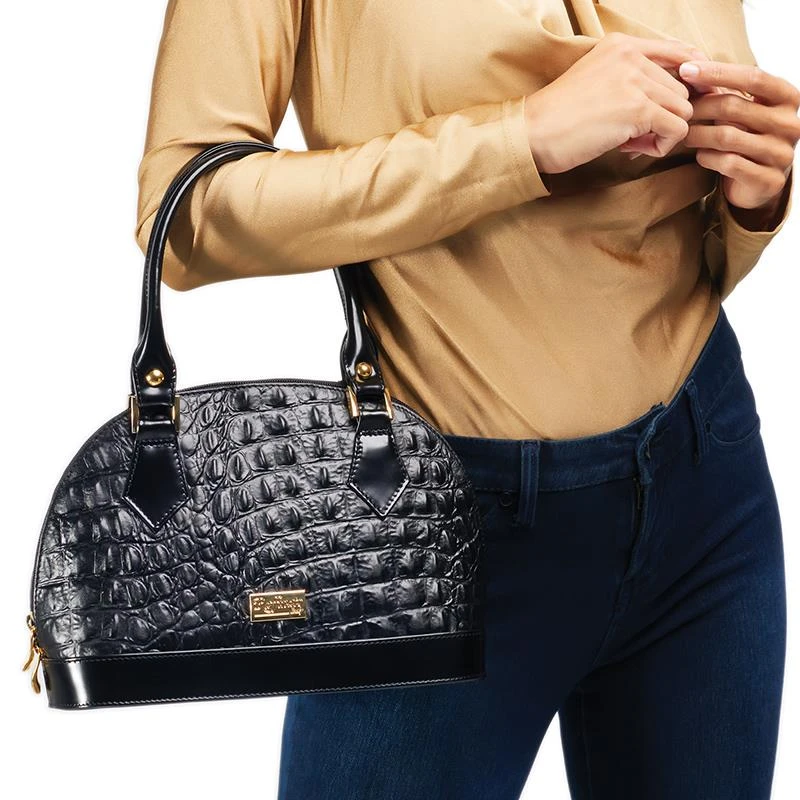 Nothing makes an impact like a sleek handbag. And thanks to our connections with Italy’s best leatherworkers, our sleek, chic Bombshell Bag can send shockwaves through your social scene for a Stauer incredible price. Gleaming black calf leather is enhanced with bold crocodile embossing and golden hardware. Sturdy handles and a removable shoulder strap make this bombshell of a bag as functional as it is stylish.