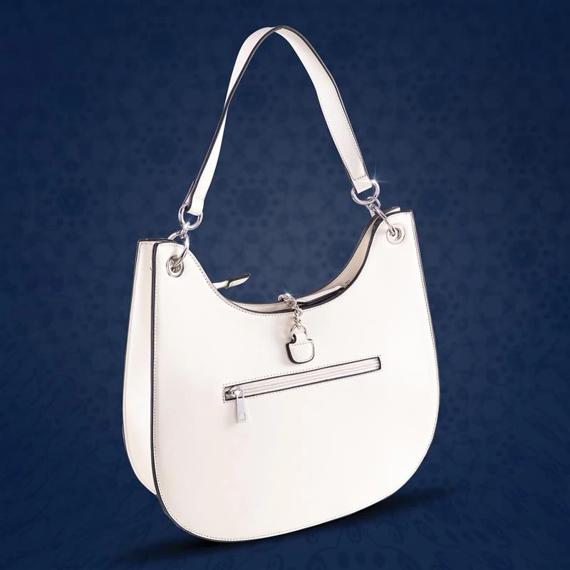 Our Donna Crescent Bag is a vision in white and her stylish crescent construction fits perfectly under your arm and strikes a streamlined silhouette when swinging at your side. Made of durable and scratch-resistant polyvinyl, this is a must-have accessory that will see you through many seasons in the sun and brighten up even the most cloudy of days.