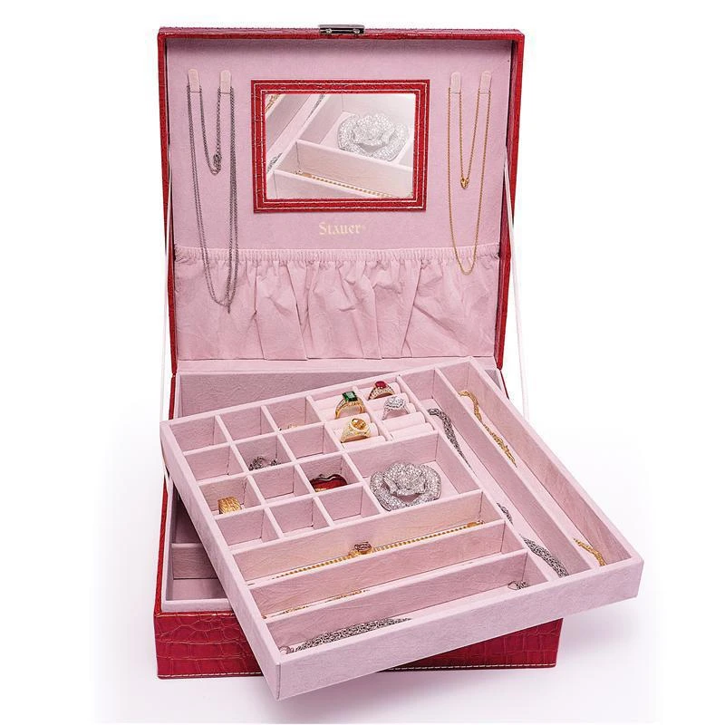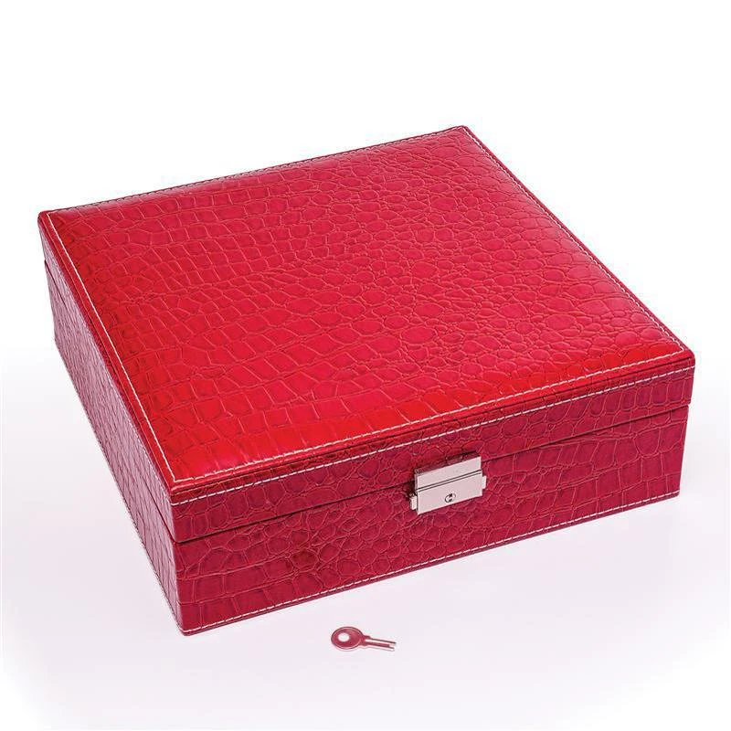 This classically designed jewelry box flaunts a gorgeous crocodile embossed leatherette exterior in ruby red, two generous storage trays and a locking top. This piece will take special care of your collection while beautifying your tabletop.